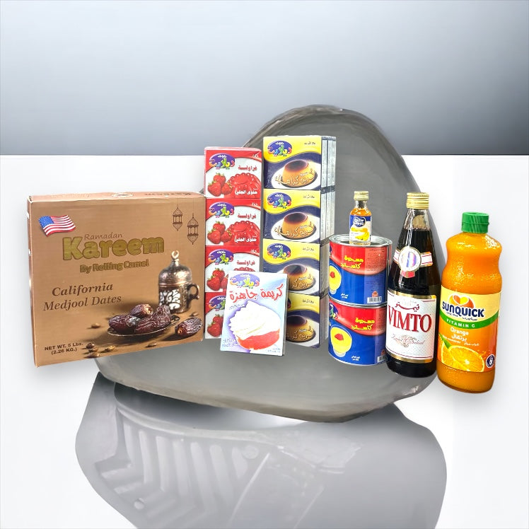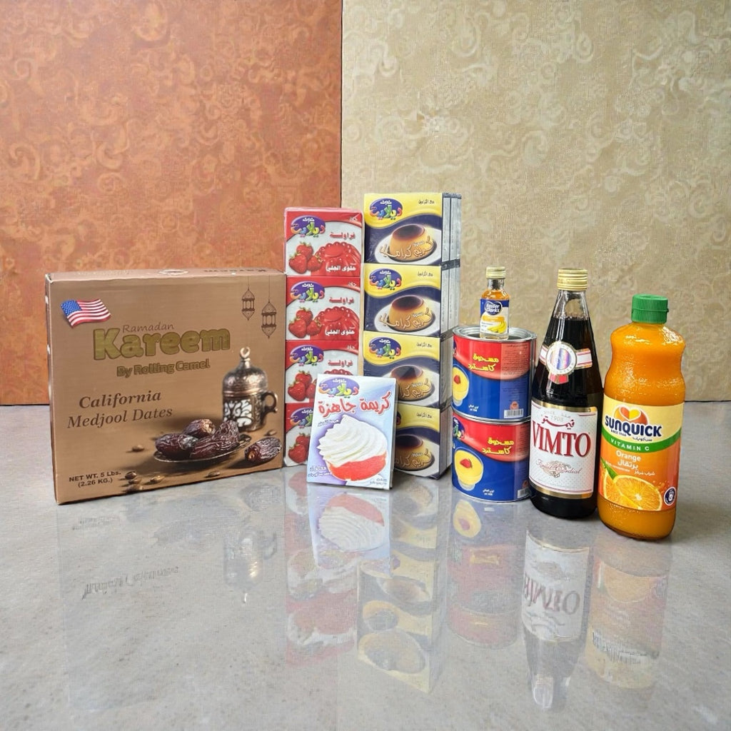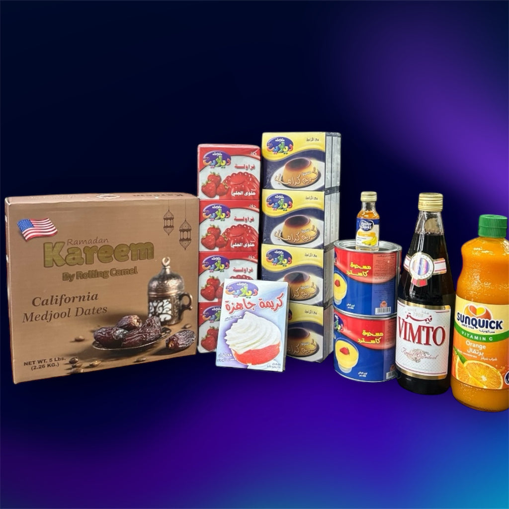 عصير سنكويك برتقال، ١ عصير فمتو، ١ درزن جيلي، ١ درزن كريم كارميل، ٢ علبه كاسترد محلبيه ،صندوق تمر مجدول ٥ باوند ،علبة كريمه، ١ روح الموز