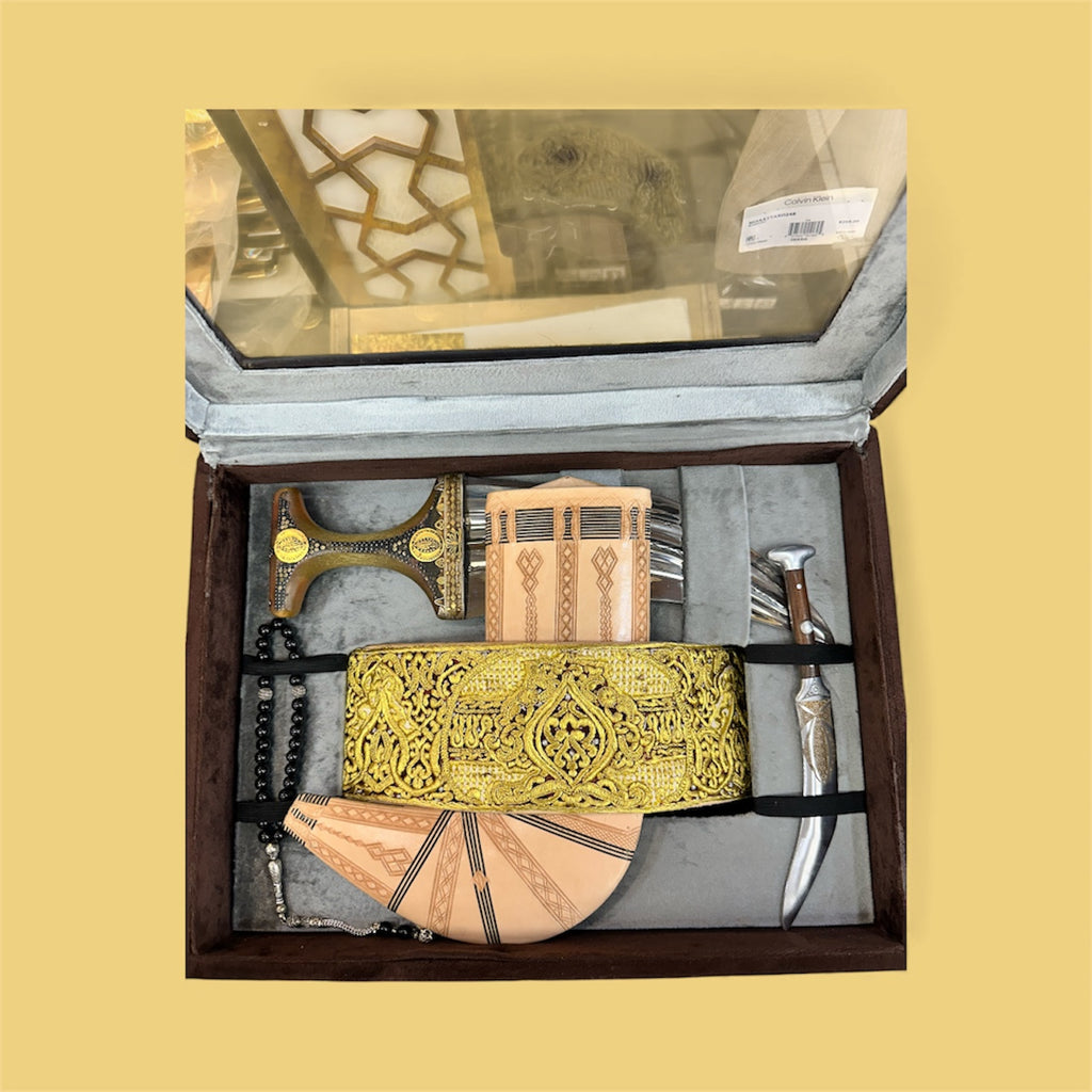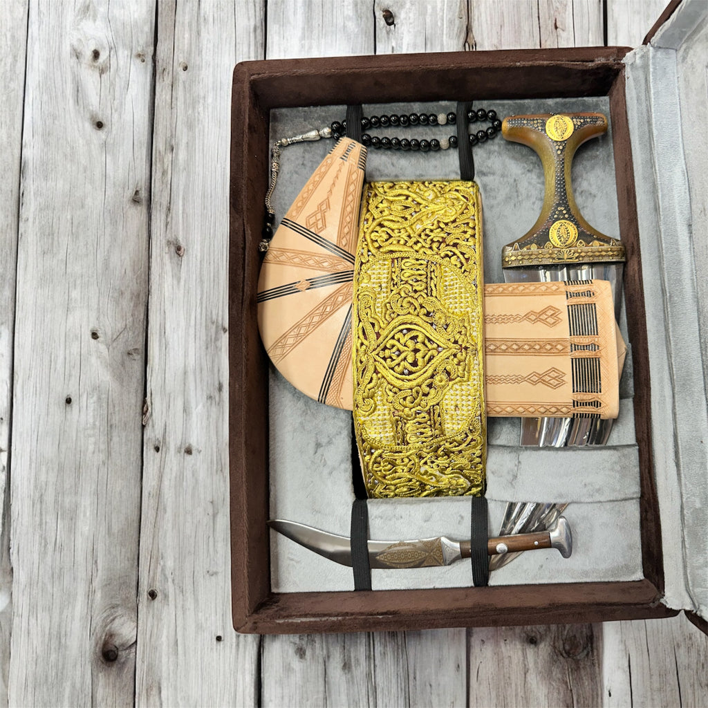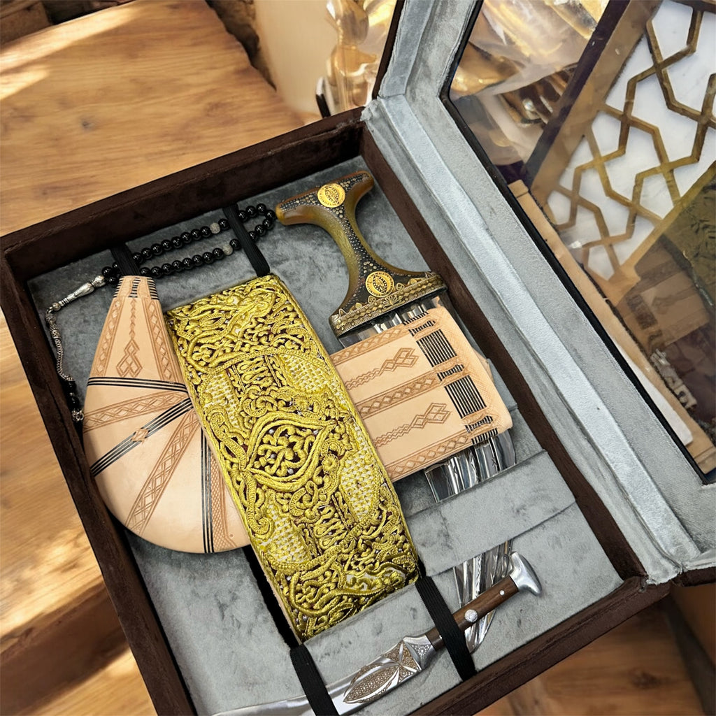 جمبية عزيري صيفاني مقلد طبق الاصل حزام كبسي شغل يدوي مع عسيب حاشدي صافي نصله ستيل منقش ذهبي تقط المسمار مبسم فضه حروب مطلي ذهب مع خنجر فضه خلفي