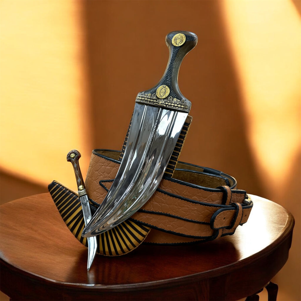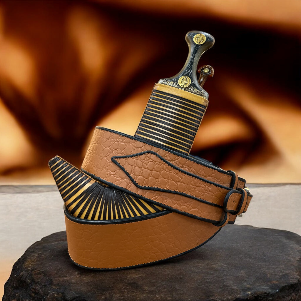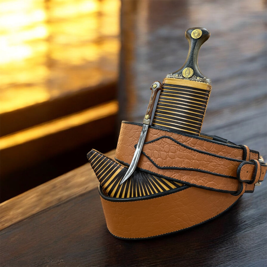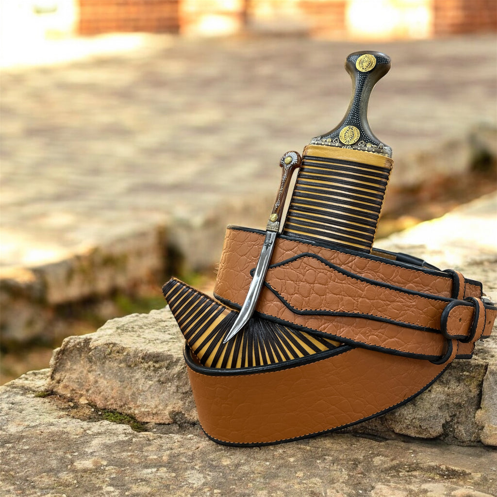 جمبية عزيري صيفاني مقلد طبق الاصل عسيب بكيلي صافي حزام شغل يد حروف مطلي ذهب مبسم فضه نصله ستيل منقش مع خنجر خلفي فضه عقيق