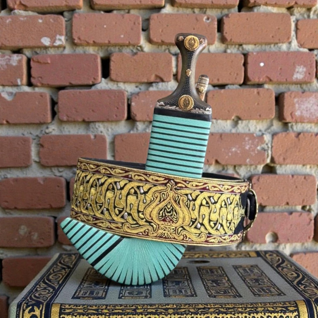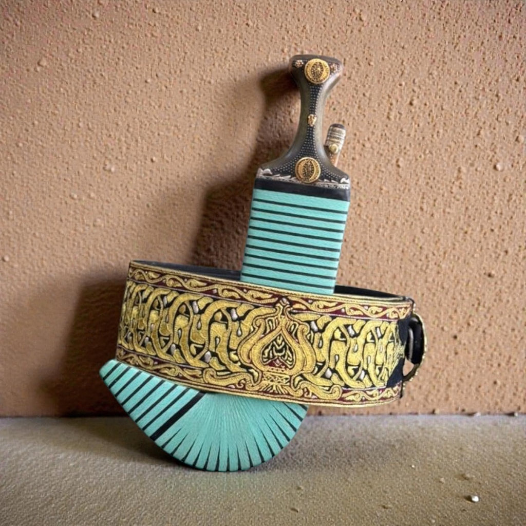جمبية عزيري آصلي صيفاني مقلد طبق الأصل حزام يدوي ، عسيب بكيلي مكحل ، حروف مطلي ذهب ، نصله ستيل تقط المسمار مع خنجر خلفي فضه عقيق