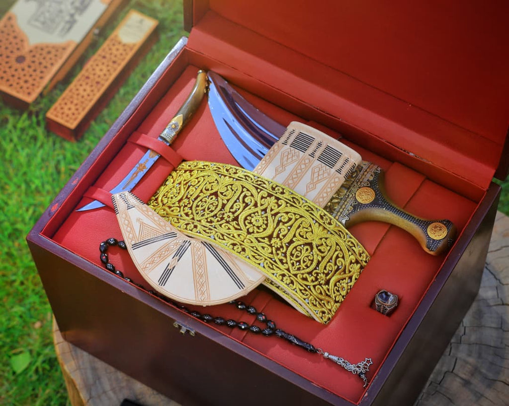 جمبية عزيري اصلي صيفاني مقلد حزام شغل يد عسيب بكسلي منقش طنب مبسم فضه حرف مطلي ذهب مع خنجر خلفي فضه عقيق