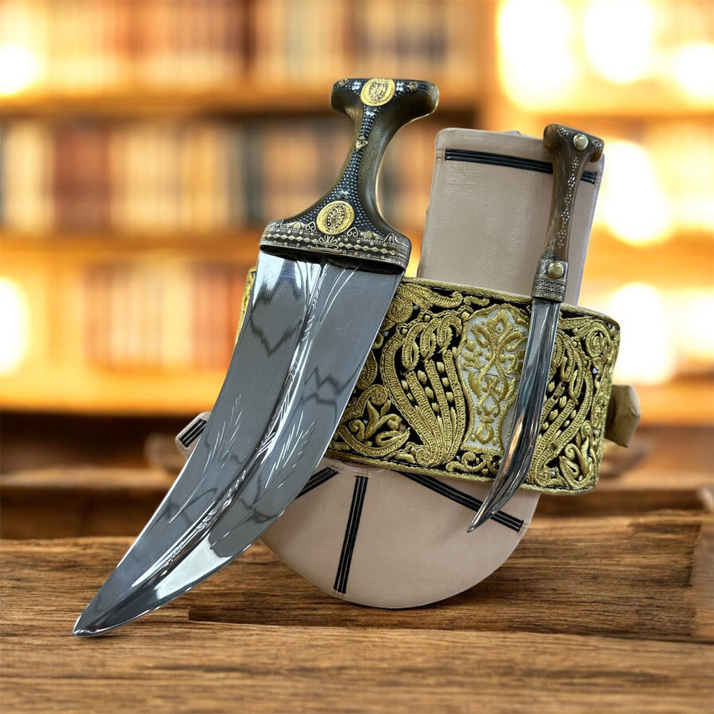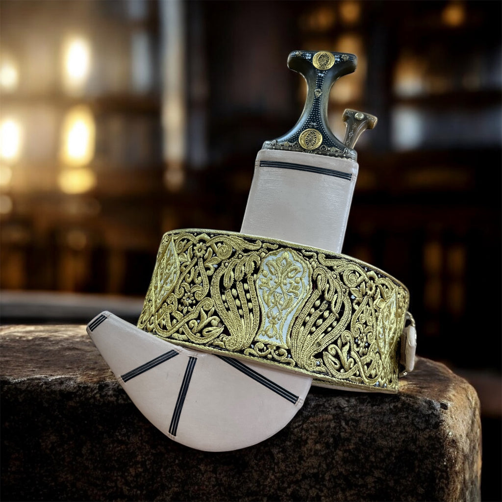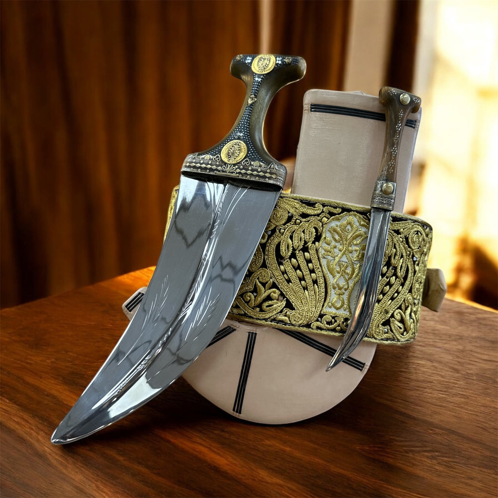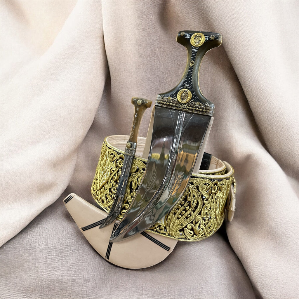 جمبية عزيري اصلي صيفاني مقلد طبق الأصل عسيب بكيلي نصله ستيل منقش تقد المسمار حزام عمل يد فص مطلي ذهب مع خنجر خلفي فضه عقيق