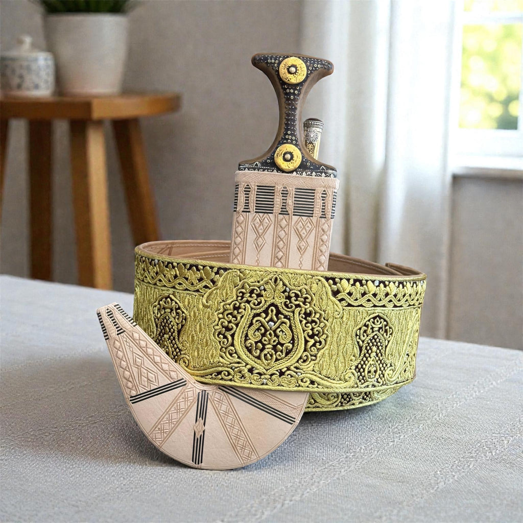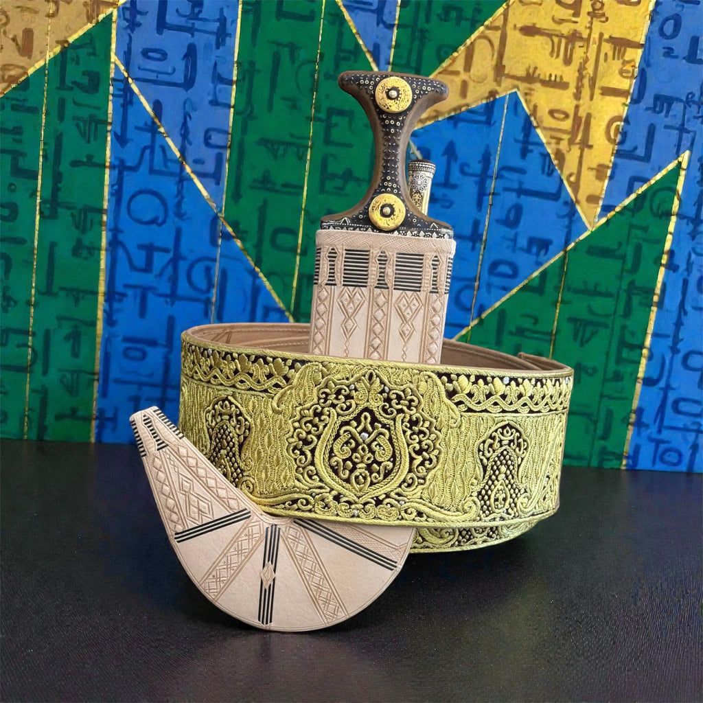 جمبية عزيري صيفاني مقلد طبق الاصل حروف ذهب حزام ملكي شغل يدوي عسيب حاشدي منقش ، مع خنجر خلفي فضه
