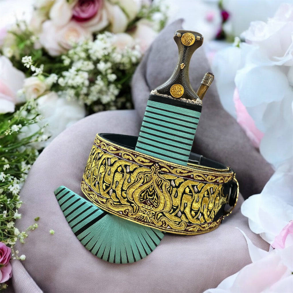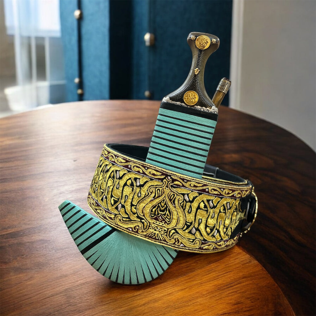 جمبيه عزيري شبيه الصيفاني طبق الاصل حزام يدوي كبسي ملون حروف مطلي ذهب نصله ستيل تقط المسمار مبسم فضه خالص