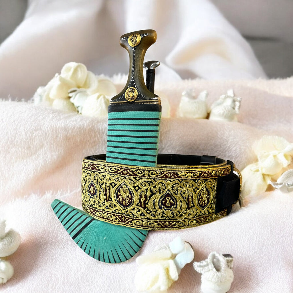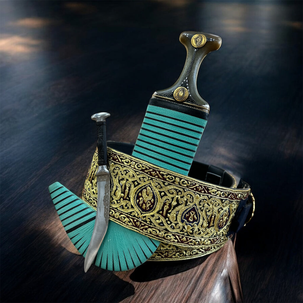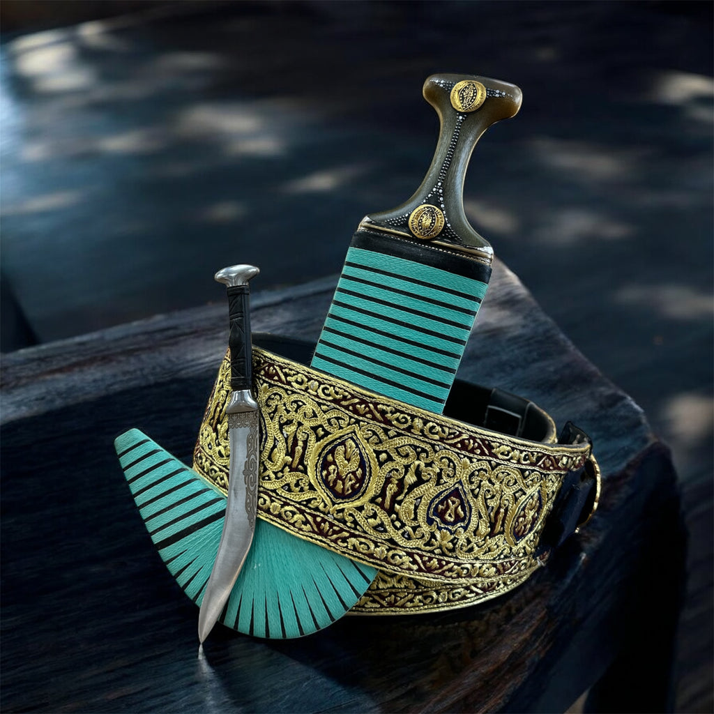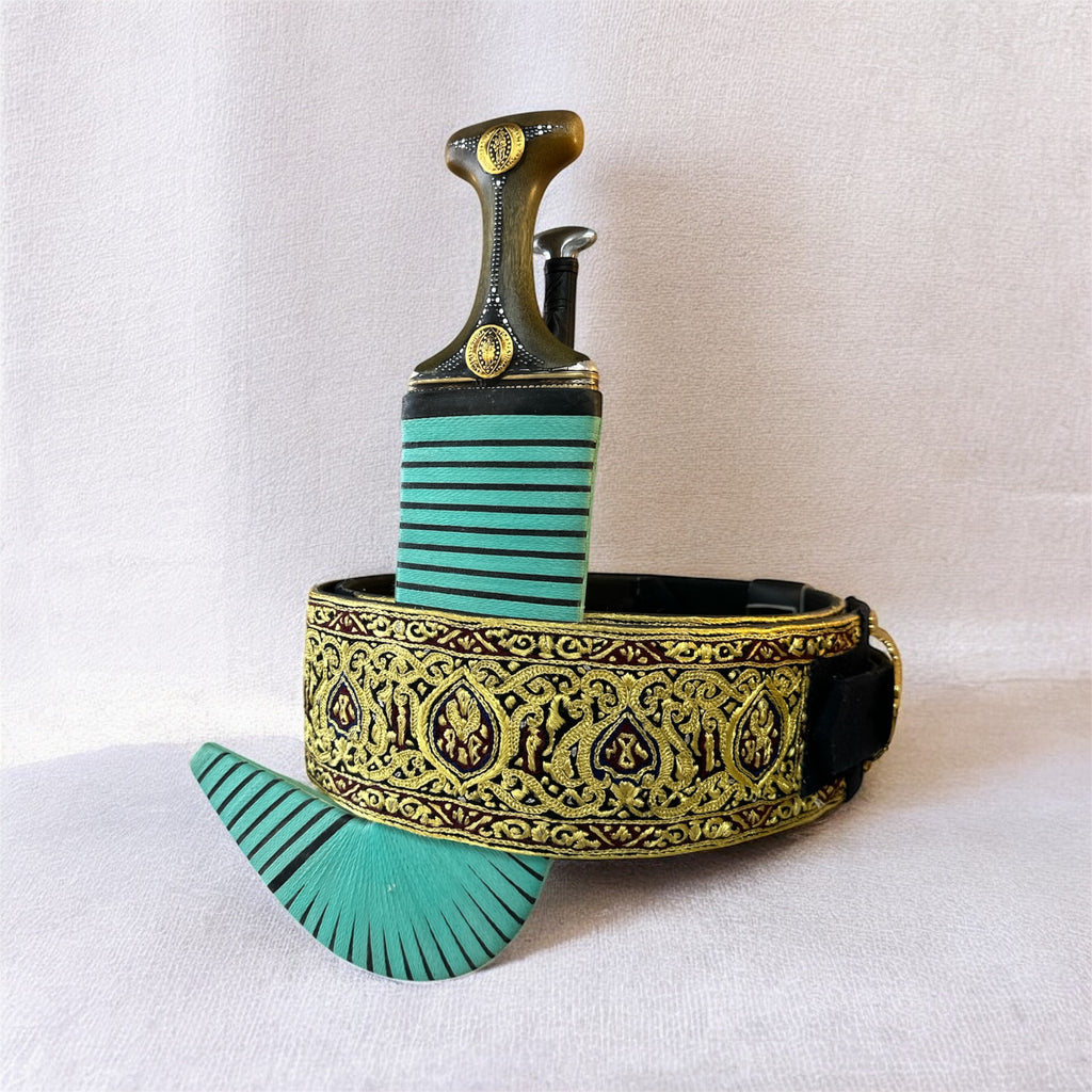 جمبيه عزيري صيفاني مقلد طبق الاصل حزام يدوي حروف مطلي ذهب عسيب بكيلي سله ستيل منقش مع خنجر خلفي