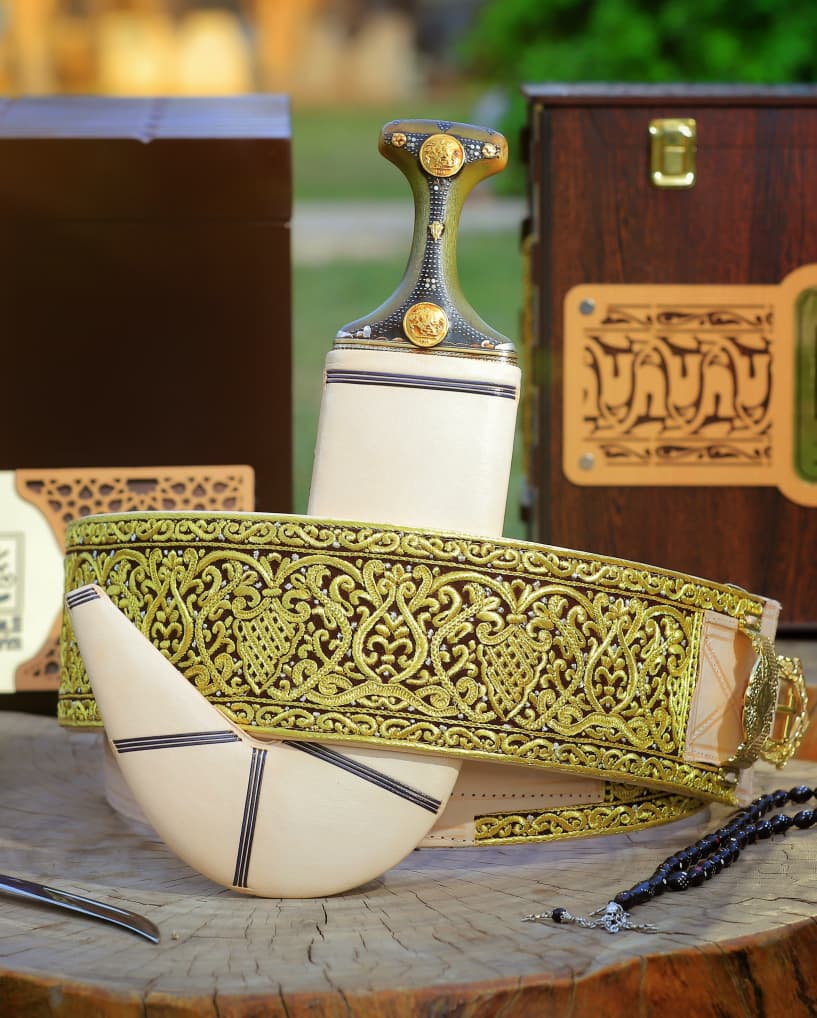 جمبيه عزيري صيفاني مقلد طبق الاصل حزام يد عسيب عشر حاشدي حروف مطلي ذهب نصله ستيل تقد المسمار مع خنجر خلفي فضه