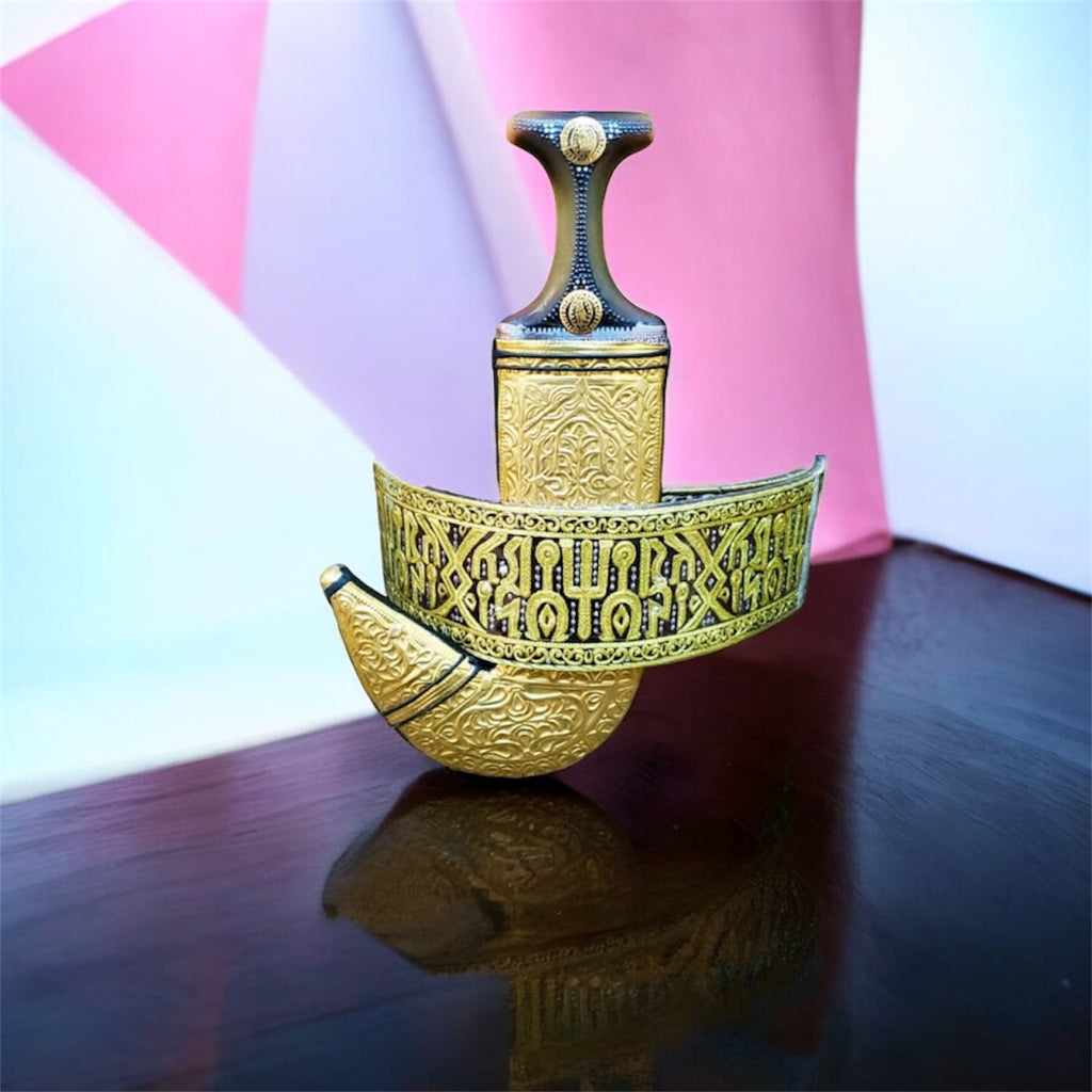 جمبية عزيري آصلي صيفاني مقلد طبق الأصل حزام يد فص مطلي ذهب نصله ستيل منقش مع خنجر خلفي فضه عقيق